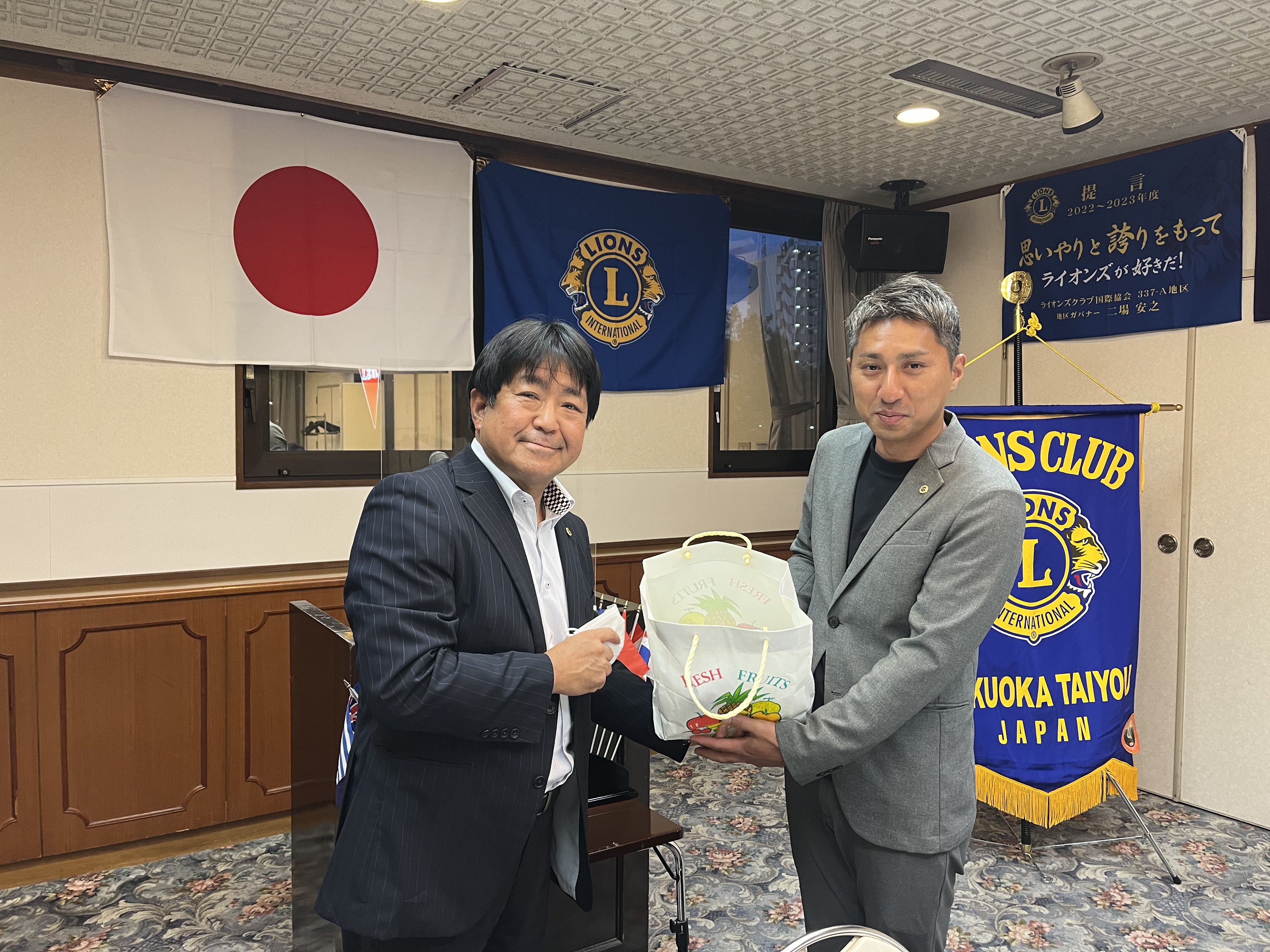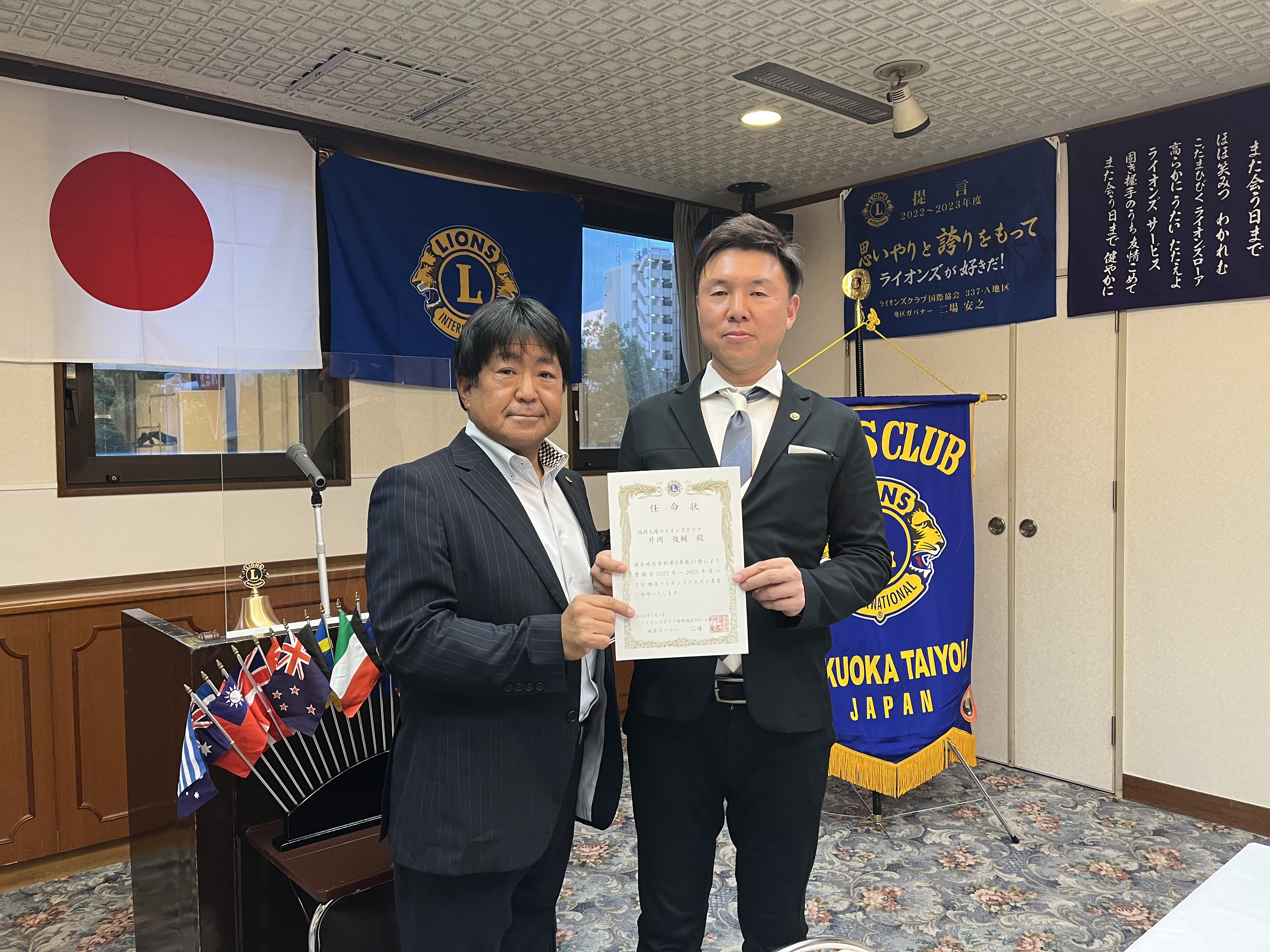 August. 30. 2022 JR博多駅前で街頭献血運動に参加しました。 L新郷、L片岡、L掛田、L久門 August. 03. 2022 誕生日会 L掛田陵作のお誕生日会。 おめでとうございます。 337ーA地区2R・1Z・Z CのL久芳志治がビジターで例会に参加されました。 L片岡俊輔に、337ーA地区2R、地区ライオンズ クエスト委員の任命状が届きました。